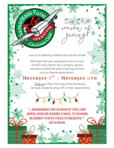 Operation Christmas Child packing dates are November 3rd-November 17th!  Drop off filled boxes to the office or your child’s classroom by November 17th at the latest.
